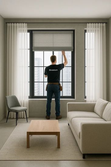Our skilled technician is seen installing custom blinds in a modern city-view living room. This image captures our commitment to precision, professionalism, and high-quality service. At Blindtore, we bring function and style to your space-seamlessly blending beautiful design with expert craftsmanship.